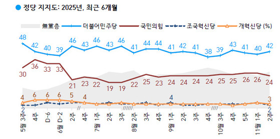 [한국갤럽 제공]정당 지지도는 민주당 42%, 국민의힘 24%로 집계됐습니다.