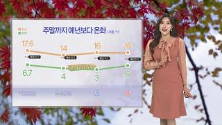 [날씨] 주말까지 한낮 포근…큰 일교차 유의온화한 가을 날씨가 이어지고 있습니다.주말까지 예년보다 높은 기온이 이어지겠는데요.대신, 일교차가 크겠습니다.하루 안에 기온이 큰 폭으로 오르내리는 만큼, 아침저녁으론 외투 도톰하게 입으셔야겠습니다.내일 출근길도 안개로 시야가 답