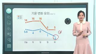 [날씨] 주말까지 예년보다 온화한 날씨…다음 주 매서운 추위주말까지 예년보다 한낮에는 포근하겠습니다.그래도 아침저녁으론 쌀쌀하며 기온이 널뛰겠는데요.일교차에 유의해 외투 도톰하게 입으셔야겠습니다.아침 출근길마다 전국에 안개도 자주 낍니다.특히, 충청 이남의 가시거리는 200m 미만으로 떨