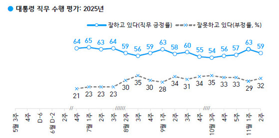 이 대통령 지지율 59%…'항소포기' 논란 속 4%P 하락이재명 대통령의 국정 지지율이 일주일 새 4%포인트 떨어지며 59%를 기록한 것으로 나타났습니다.한국갤럽이 지난 11일부터 13일까지 전국 만 18세 이상 1,003명을 대상으로 이 대통령의 직무 수행에 관한 의견을 조사한 결과,