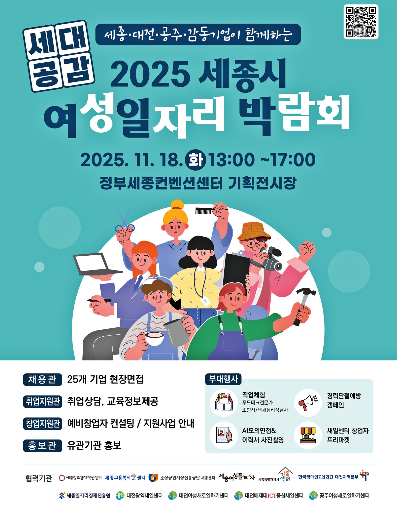 세종서 18일 여성일자리박람회…충청권 25개 기업 참가정부세종컨벤션센터서 현장면접·창업자문 등 60개 부스 운영세종시는 오는 18일 정부세종컨벤션센터(SCC) 기획전시장에서 '여성일자리박람회'를 개최한다고 오늘(13일) 밝혔습니다.이 박람회에는 세종, 대전, 충남 공주 소재 25개